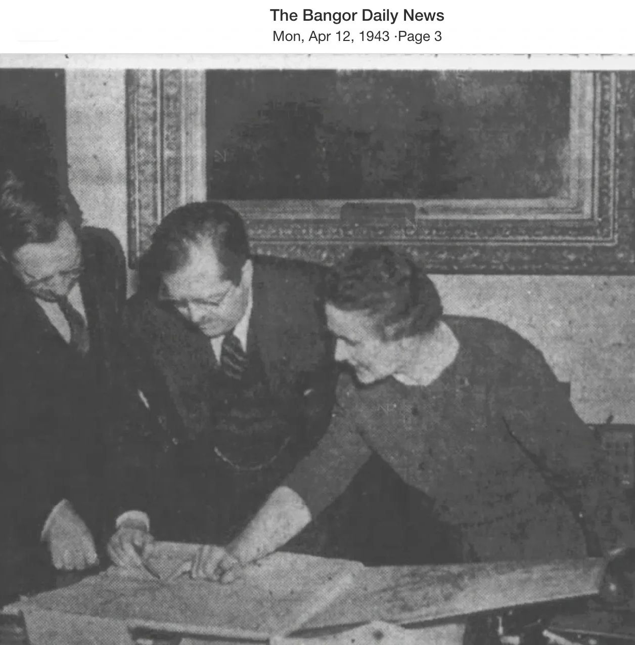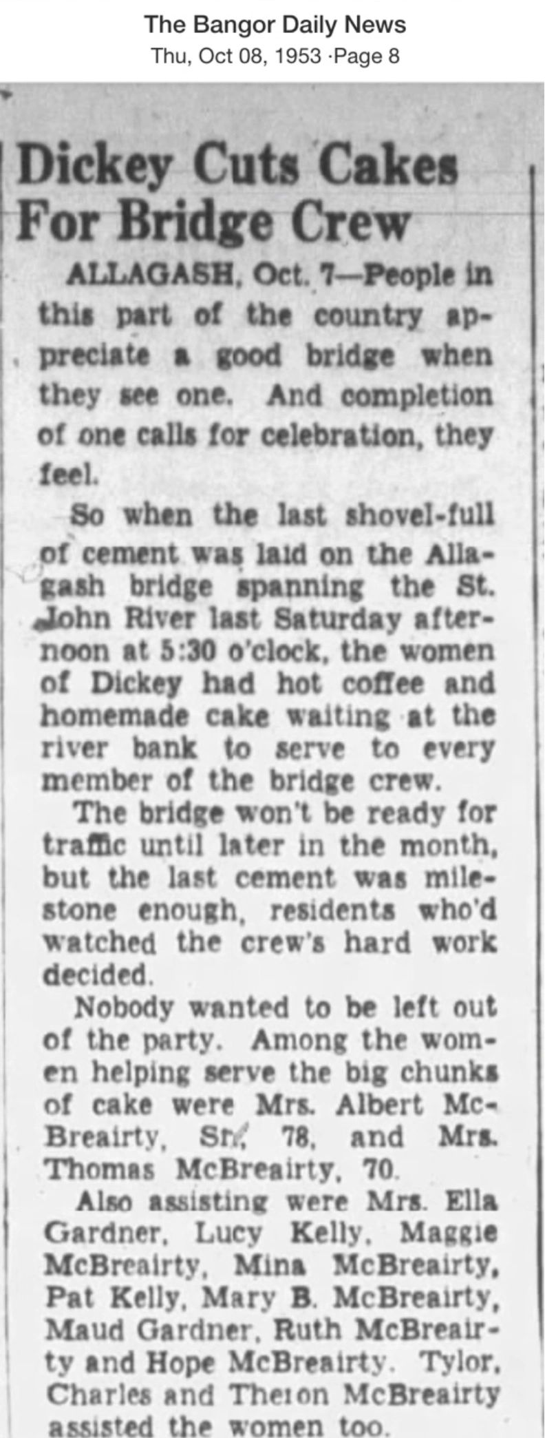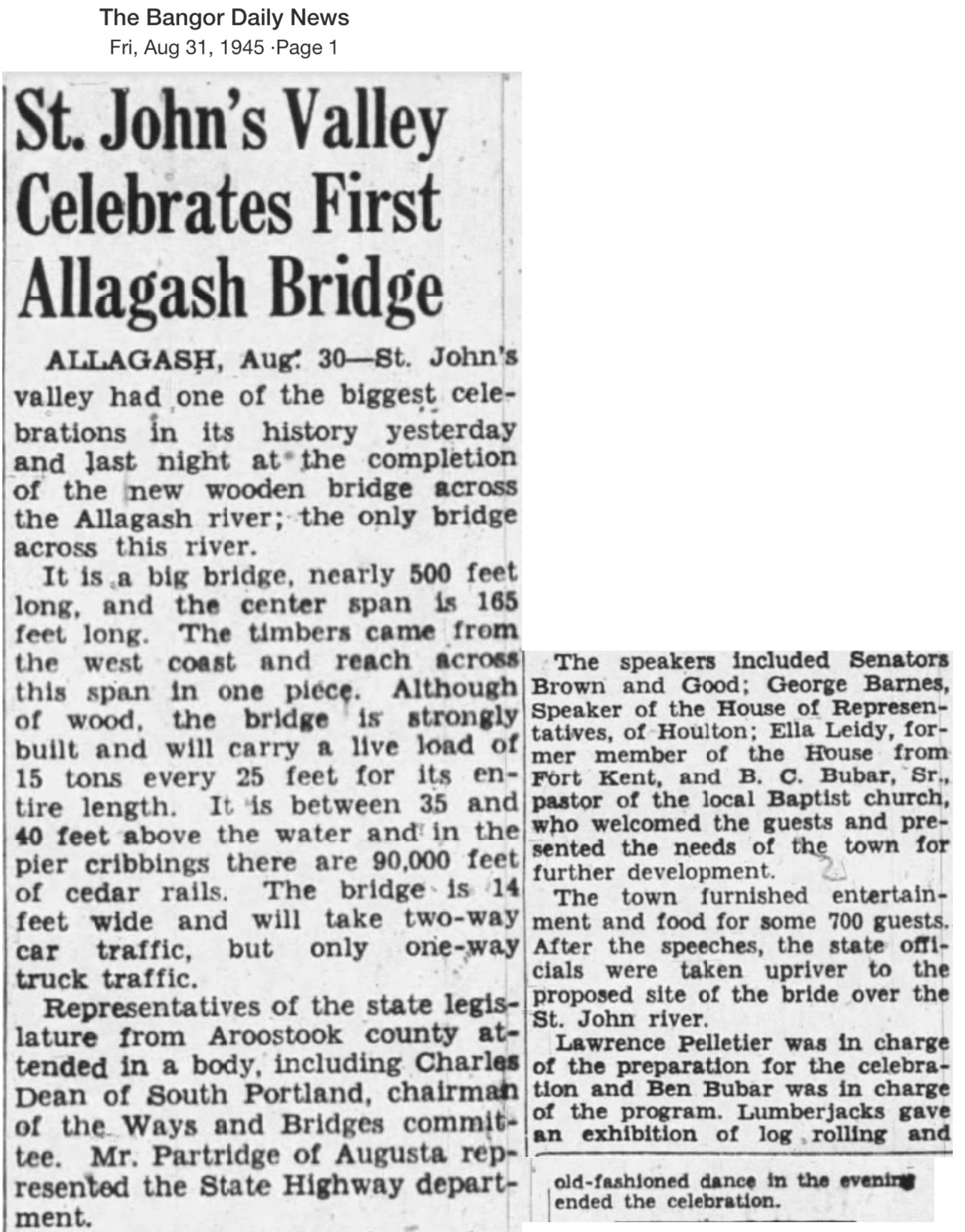 This bridge was built to replace a ferry. Due to the wartime steel shortage, it was built of wood fastened with steel plates. It was supported by high wood-crib piers. The timber bridge had two spans of 120' and one of 160'. The 1956 replacement was a 3 span steel girder, 360' long with 14' roadway. The current bridge was built in 1992 with 3 welded steel spans 400' long and 28' roadway. MDOT Bridge #2014. Roy Wentzel Photo, June 23, 1954, Maine Department of Transportation Archives