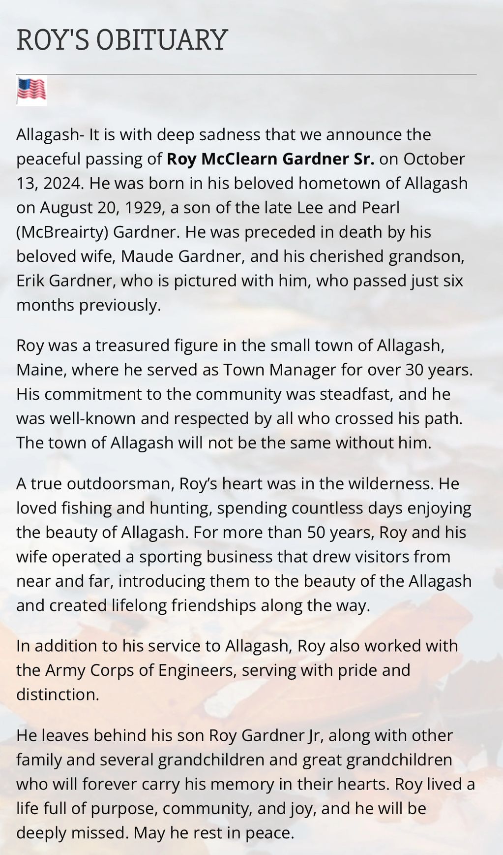 “He was born in the house where he lives in Allagash .  My father was born and raised there as well . it was built by my grandfather”